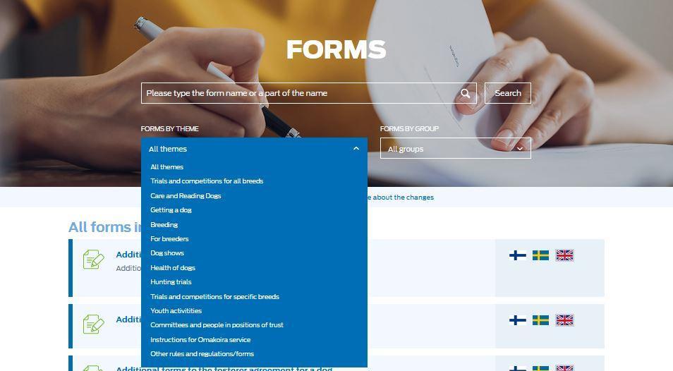 In the drop-down menus Forms by theme or Rules and regulations by theme, you can choose to sort the documents by theme. When you have chosen a theme from the drop-down menu, more filtering options within the theme in question will appear. These will filter the documents more accurately.