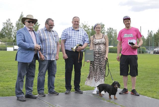 – Ei meille koskaan mitään mäyräkoiraa ollut edes ajateltu hankkia. Viitisen vuotta sitten vaimo kuitenkin ilmoitti, että hän haluaa meille ”sohvakoiran”. Ajatus ei miellyttänyt minua aluksi lainkaan, koska harrastan enempi käyttöpuolen koiria. Itselläni oli kyllä jälkikoiran tarvetta, ja vähitellen sain ohjattua rodunvalintaa metsästyskoiriin päin. Kompromissirotu oli mäyräkoira, koska pitkäkarvainen versio niistä oli vaimonikin mieleen. Tarjontaa pitkäkarvaisista oli silloin kuitenkin vähän, joten valittiin versioista helppohoitoisin eli säämiskämalli, kuvailee Harri rodunvalintaa.